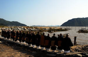 | 福州にある赤岸鎮へお大師様と共に向かう | 空海漂着記念碑の前で読経 |