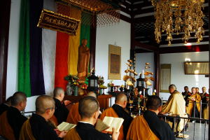 | 遥か彼方の日本から入唐されたお大師様を思う一行 | 空海大師祈念堂にて法要。導師は藤間実行委員長 |